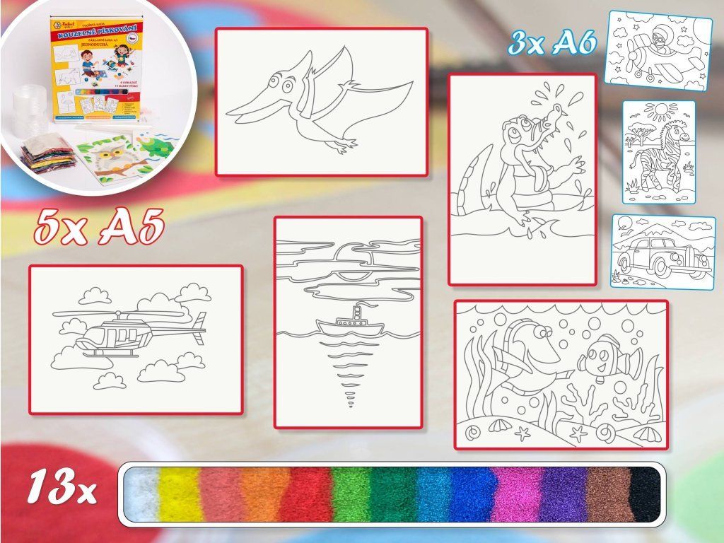 Hlavním prvkem tvoření je kvalitní barevný písek, který je zdravotně nezávadný, sytě zbarvený a snadno se s ním pracuje. Děti si tak mohou hravou formou vytvářet vlastní umělecká díla, rozvíjet kreativitu a zažít radost z vlastního tvoření.