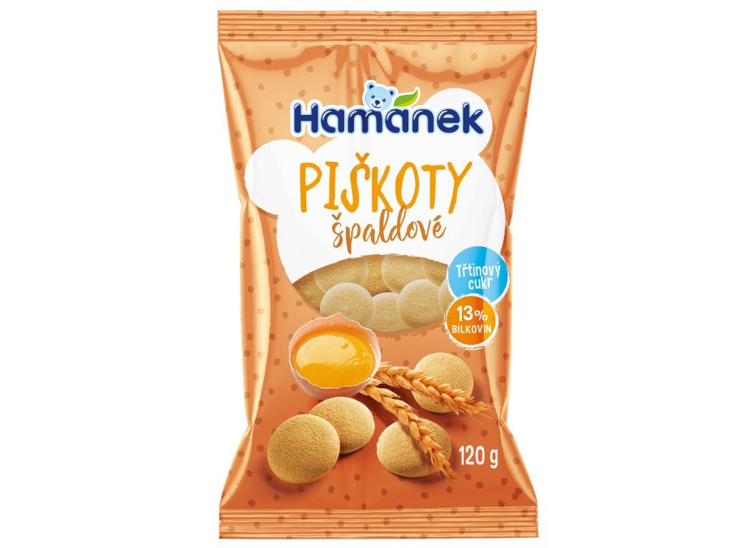 Hamánek Piškoty Špaldové 120 g jsou tradiční piškoty upečené z vybraných surovin – celozrnné špaldové mouky, čerstvých vajec a přírodního třtinového cukru. Tato kombinace dává piškotům jemnou a křehkou strukturu s lehce sladkou a oříškovou chutí.