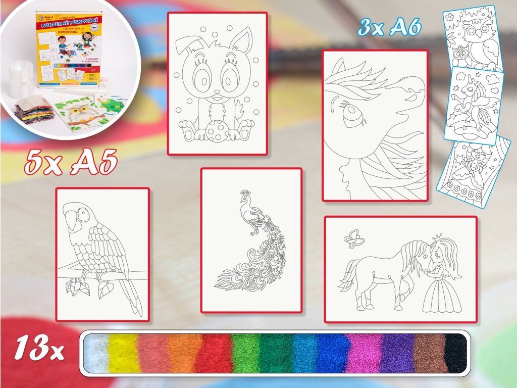 Hlavním prvkem tvoření je kvalitní barevný písek, který je zdravotně nezávadný, sytě zbarvený a snadno se s ním pracuje. Děti si tak mohou hravou formou vytvářet vlastní umělecká díla, rozvíjet kreativitu a zažít radost z vlastního tvoření.